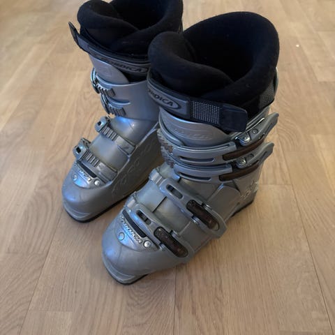 Salomon skistøvler med størrelse 240 mm, i fargene rød og grå. Skistøvlene har spenner for justering og er designet for alpint bruk.