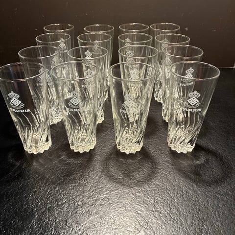 Farris glass i klart glass. Settet består av 20 stk glass med Farris-logo og dekorative mønstre. Ingen knast eller slitasje på mønsteret