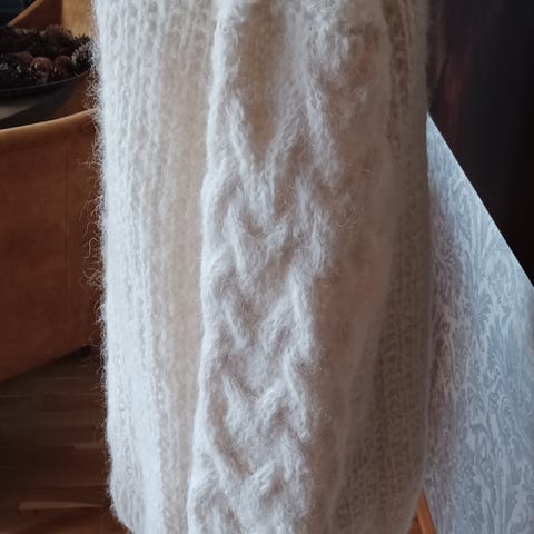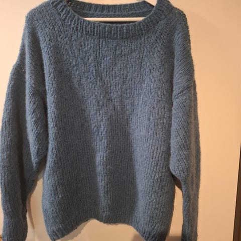 Ny genser som ble for liten . Garn : alpaca / fairytale. Farger -blå nr 704. Lyseblå nr 703. Hvite er ‘kritt’ Høyde 60. Br 48. Under erme 48. Kan sende i oppkrav
