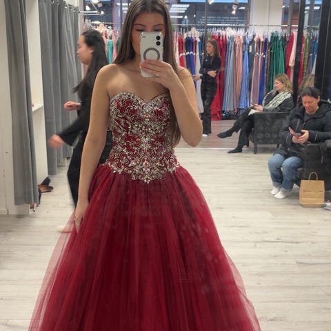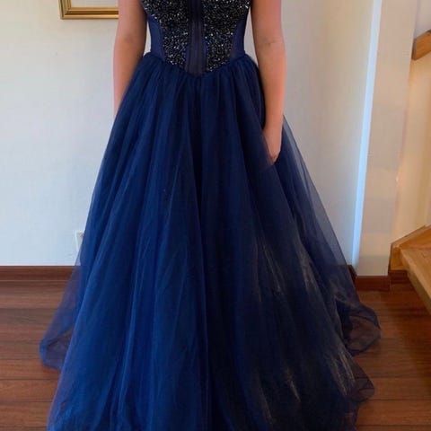 Nydelig ballkjole fra Tina Ritzi leies ut. Kjøpt ny november 2025 (nypris 4200,-). Brukt én gang. Farge lys blå. Kjolen er lagt opp noe, hun som har brukt den er 162 cm høy. Underskjørt medfølger. Veske og hårspenne kan medfølge hvis ønskelig.