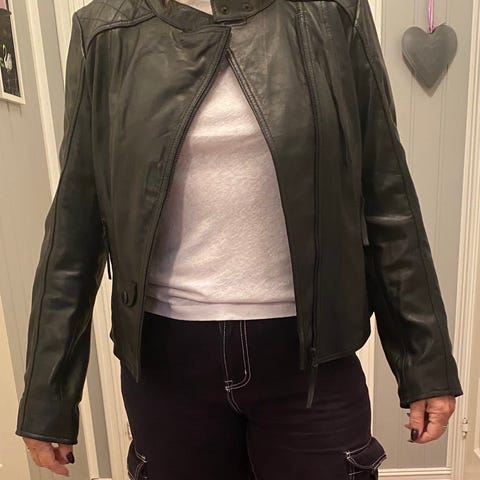 Tøff skinnjakke i størrelse 38. Jakken har ekte skinn på overkroppen og stoff på undersiden av ermene og nederst, noe som gjør den veldig behagelig å ha på.