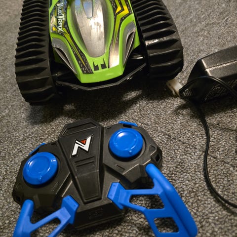 Sett med to fjernstyrte kjøretøy: en grønn offroad bil og en gul lastebil. Lastebilen har elektrisk tipp av lasteplan. Begge kjøretøyene leveres med egne fjernkontroller oppladbart batteri og USB-ladere. Testet og fungerer fint. Sender ikke, må hentes.