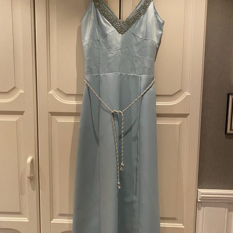 Nydelig blå kjole kjøpt til ball men fikk ikke brukt den pga sykdom 🦠god lengde på kjolen og gode justerings muligheter med snøring i ryggen ..vil nok passe best til deg med høyde fra 170+cm da det er god lengde på kjolen.Kan passe str M-L.