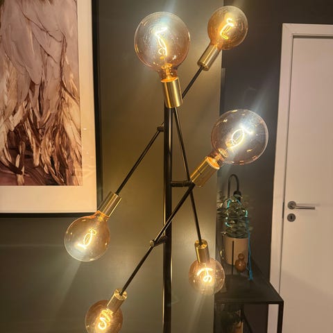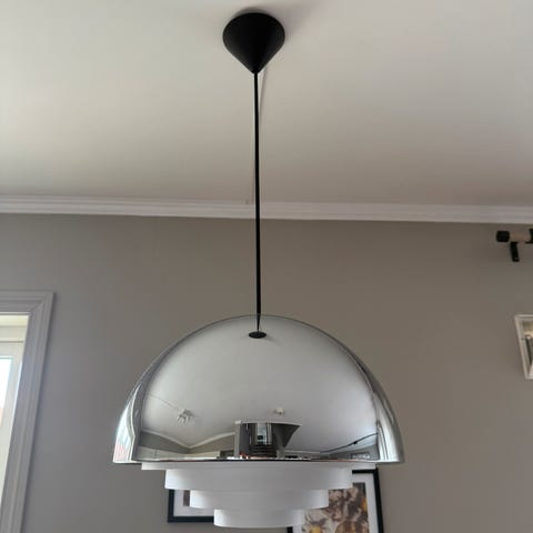 taklampe laget i metall med tre lyskilder. Lampen har et industrielt design og er egnet for takmontering i ulike rom. Bredde 100 cm Høyde ca 100 cm.