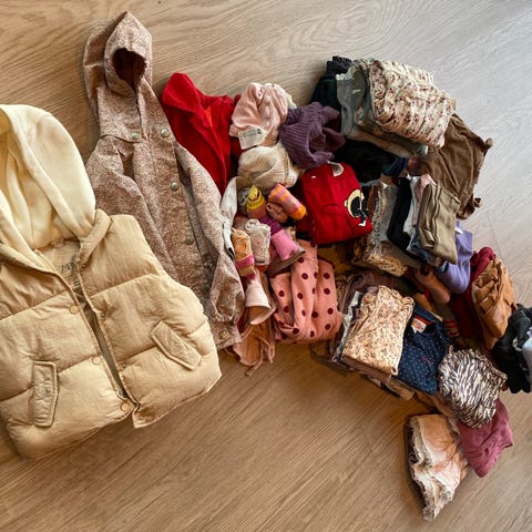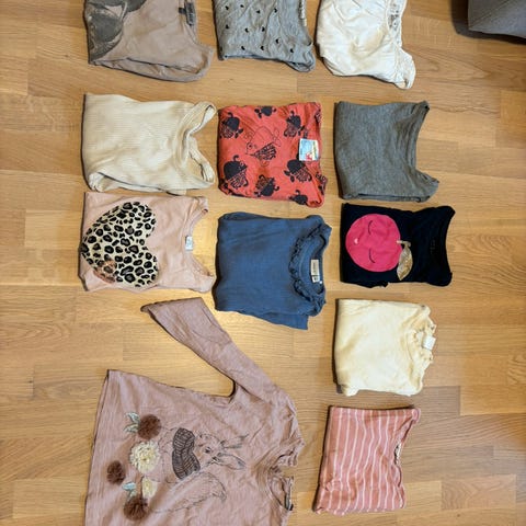 Enkelte plagg bærer preg av hyppig bruk/vask. Flekker forekommer også på enkelte plagg. Mye av klærne er pent/lite brukt.