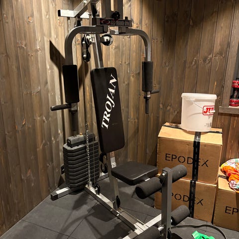 Body-Solid treningsapparat med tilhørende vektskiver. Apparatet er designet for styrketrening med flere funksjoner og øvelser. Vektskivene er i metall og kan justeres for å tilpasse treningsintensiteten.