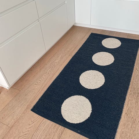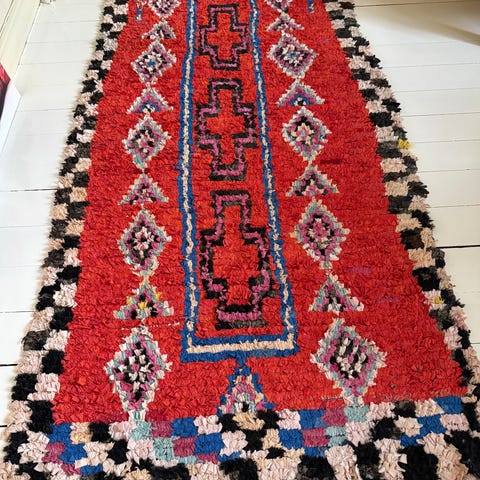 Nydelig marokkansk berberteppe i hvitt, rosa og blått. Fra YAP design. Helt ubrukt. Det ble for stort her det var tenkt. Målene er ca 305 cm langt og 91 cm bredt. Helt nydelig og mykt ullteppe. Kjøpt for ca 3500,- på salg. Vanlig pris mye høyere. Håper noen andre kan få glede av dette helt nydelige teppet :)