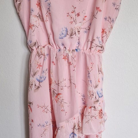 Lindex flerfarget kjole i størrelse 134 for jente, laget av polyester. Kjolen har broderte blomsterdetaljer og røde kanter langs ermene og nederst på skjørtet. Den har en elastisk midje for bedre passform.