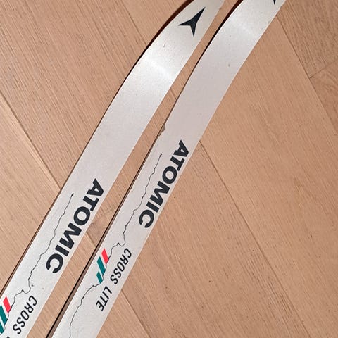 Atomic langrennsski med staver, lengde 130 cm, i svart og rød farge. Ski og staver er egnet for langrenn og har en klassisk design.