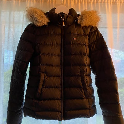 Pent brukt vinterjakke fra Tommy Jeans i str S, men den er liten i størrelse og tilsvarer heller en XS. Hetten har knapper og kan taes av.