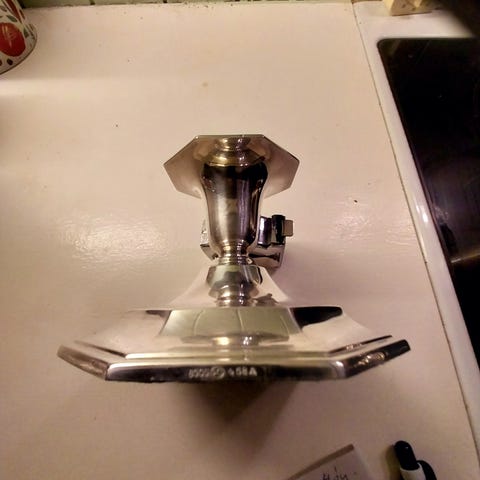Gaffelen er blank pg fin,men har noen små prikker/flekker på høyre side der gaffelen begynner å bøye seg.Får det ikke på bildet,og vet ikke hva der er Vil ikke skure med noe.