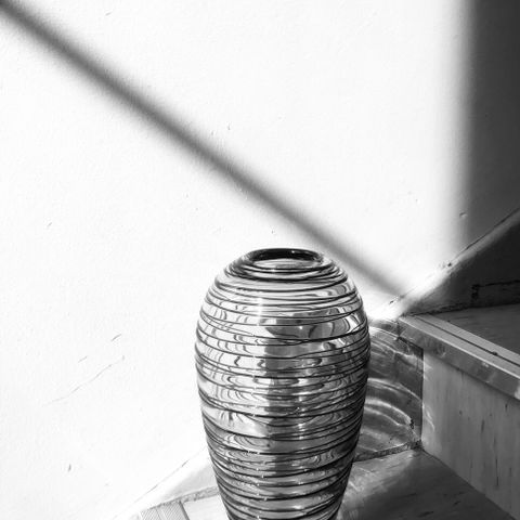 Stor dekorativ glassplate i kunstglass, ca. 46 cm i diameter. Abstrakt design i sterke røde, gule og mørke toner. Leveres i original eske. Flott som blikkfang på bord eller vegg. Pent brukt.