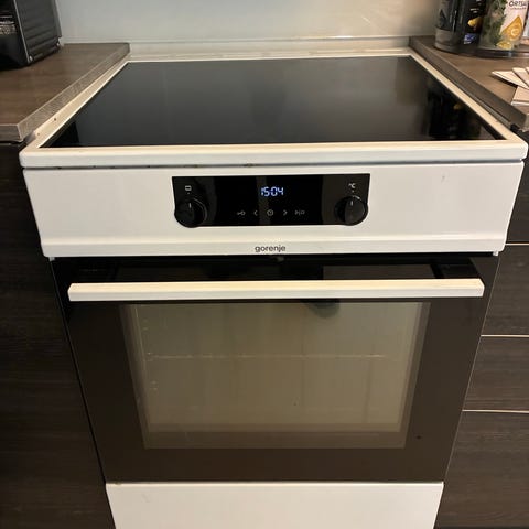 Spenning: 220–240 V / 50 Hz. Maks effekt: 9,2 kW. Kan trenge en ekstra rengjøring. Pakning innenfor døren er røket nederst. Medfølgende rist og et stekebrett. Fungerer ellers som den skal. Må hentes.