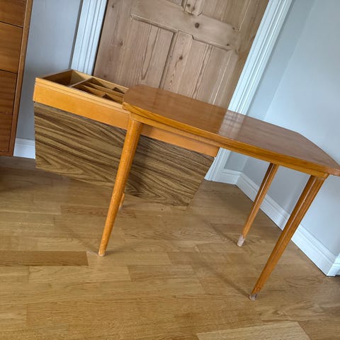Lite pent sybord med 2 skuffer, av eldre årgang og i god stand, litt slitasje på bordplate