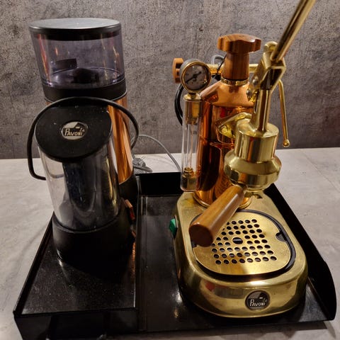 Espressomaskinen er også nyrenset, og har fått byttet gruppepakning og sil (satt in ny type sil med flat skrue for bedre espresso - visstnok). Lager flott kaffe og steamer bra. Damprør er noe korrodert, se bilde. Ny damprør-tupp fås kjøpt ganske billig. Denne maskinen er av nyere type, med fullt fleksibelt damprør, koker med utskiftbart varmeelement (tror jeg), ny type slange mellom pumpe og koker, samt justerbar trykkventil for mulighet til å justere trykk - noe de eldre modellene ikke hadde.