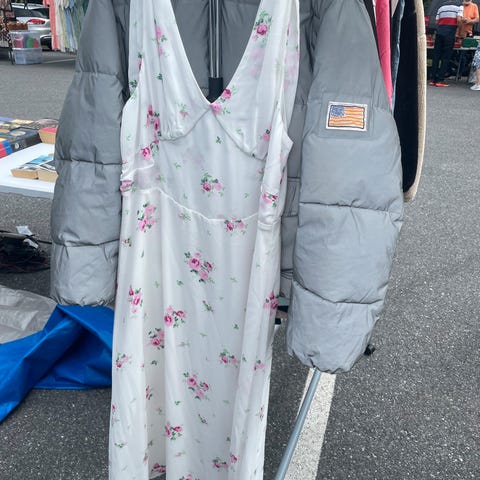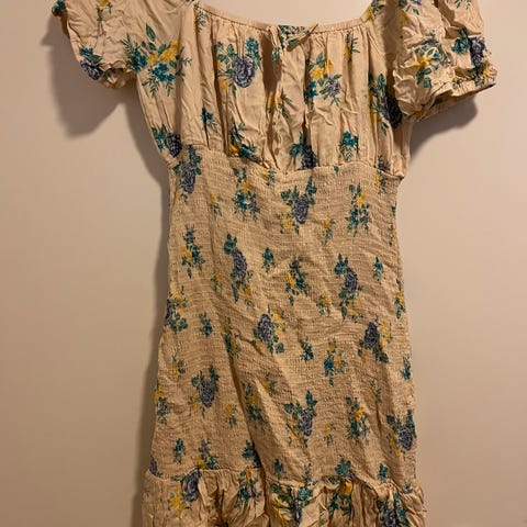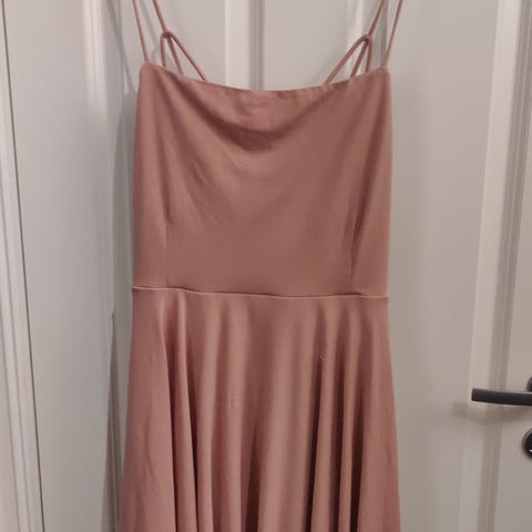 Bik Bok sommerkjole i størrelse L, laget av polyester. Kjolen har en rosa basefarge med blomsterprint og inkluderer belte for justering i midjen. Den har lange ermer med mansjetter og knapper, og en v-hals.