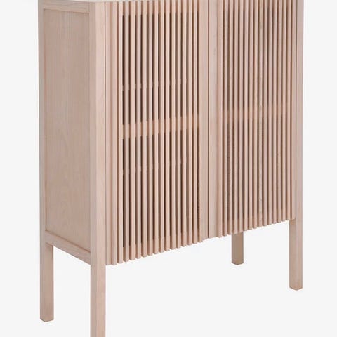 Skapet er veldig solid (og ganske tungt). Det er laget av robust, FSC-sertifisert valchromat med ribbet, elegante glassdører og en holdbar stålramme. Skapdørene kan enkelt tas av ved frakt.
