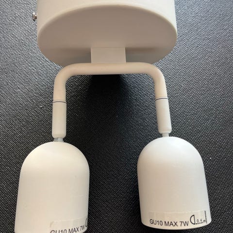 Det står led-pærer i alle spottene, alle fungerte da jeg tok lampen ned. Lampeledning m/støpsel følger med.