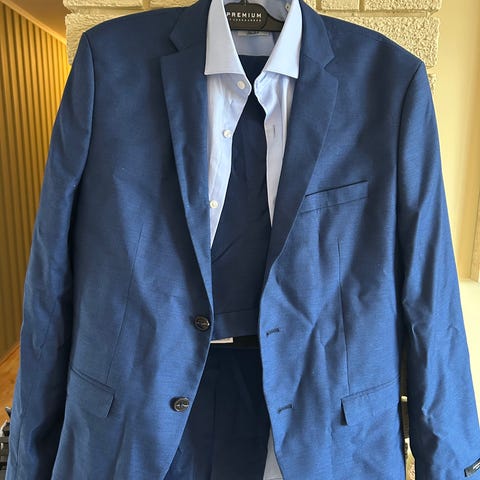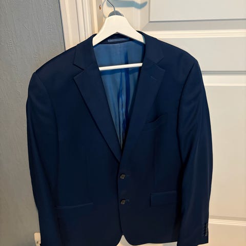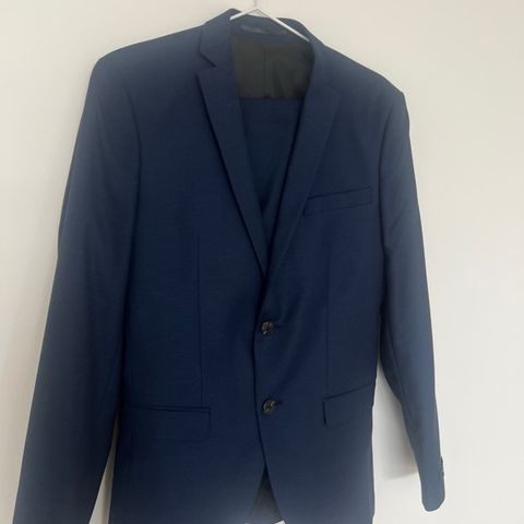 Bukse str 50, jakke str 48 og vest str 50. Hvit skjorte str M fra Dressmann.