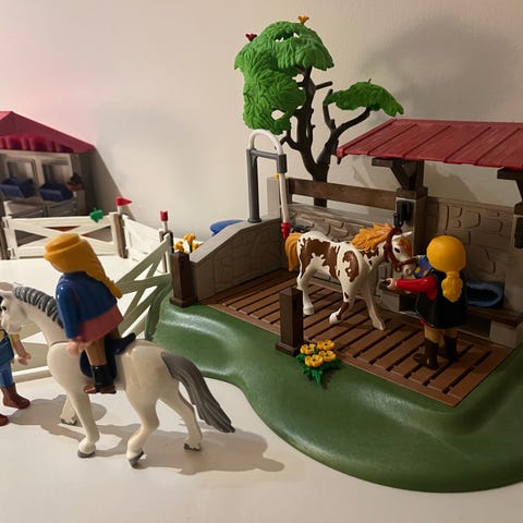 Playmobil lekesett med hester, figurer og tilbehør. Settet inkluderer flere fargede hester, små figurer, trær og planter, samt en grønn base. Passer for barn som liker rollelek og utendørs scener.