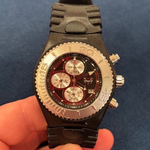 Jeg har hatt flere Chronotech klokker, to av dem er utslitt. Denne er en herreklokke og ble litt for stor for meg, men jeg eeelsker fargen! Prismeglasset er skikkelig kult!