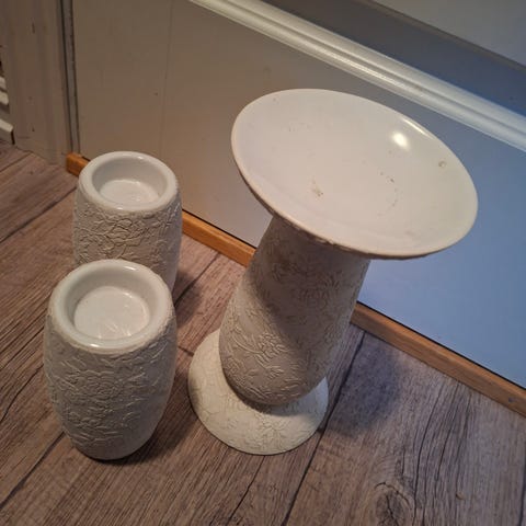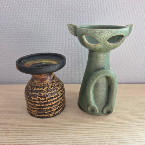 Morsom katt (20cm) og telysestake (29cm). Ingen skader og lite slitasje. Pris er samlet. Billigste porto blir 69kr med Postnord utenom fiksferdig.