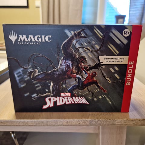 Vant en Magic The Gathering Marvel's Spider-Man bundle i en konkurranse og åpnet den med en kompis fordi vi digger spider-man og ville se hva vi fikk. Men igjen av oss spiller eller samler på MtG kort så ser ikke noe åoeng i å ha det liggende.