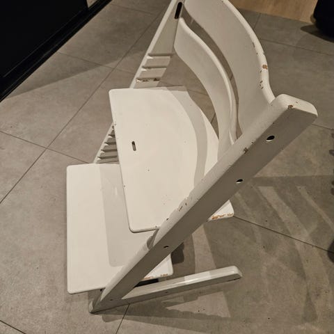 Stokke tripp trapp barnestol i fargen hvit. Malingen er skrapet av noen plasser, ellers ingen mangler. Ny modell.