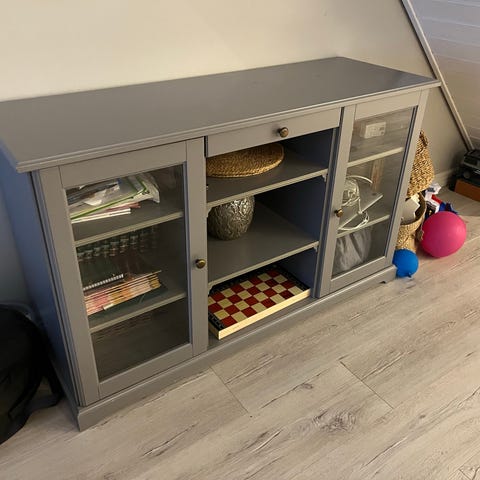 Hvit skjenk med glassdører med hyller på hver side, og hel dør med hyller og to skuffer i midten. Skjenken er tung, så må ha bærehjelp. Det er noen merker på toppen som du kan se på bildene.