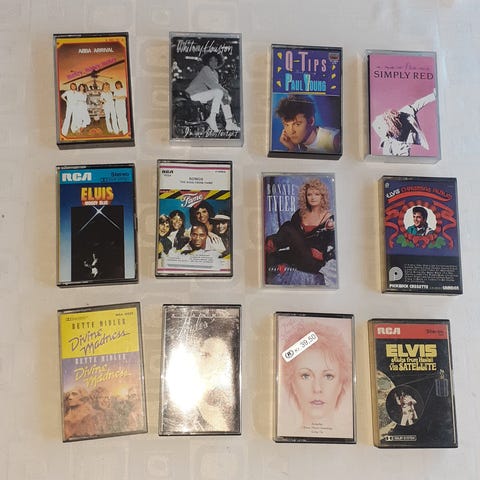 Samling av kassettalbum med musikk fra ulike artister og band, inkludert ABBA, a-ha, James Joplin, Aleksander, og flere. Kassettalbumene varierer i farge og design, og representerer forskjellige sjangere og tidsperioder innen musikk.