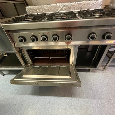 Profesjonell gasskomfyr med fire brennere og integrert stekeplate. Komfyren har justerbare knotter for kontroll av varme og en underhylle for oppbevaring. Egnet for kommersiell bruk i kjøkkenmiljøer.