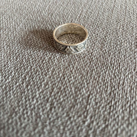 Sølvring i 925S selges kr 500. Norrønt inspirert mønster, men ukjent opphav. Ringen er ca 25 år gammel, men ubetydelig brukt. Den trenger bare litt puss. Ringen er ca str 53, eller 18 mm innvendig diameter. Ringen er justerbar. Befinner seg på Hamar.