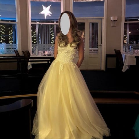 Tina Ritzie, Mira Ballkjole i en nydelig gul/champagnefarge. 💛 Kjolen er kjøpt i 2025 og merket som størrelse 38, men passer også godt for personer med både litt større og litt mindre størrelser. Jeg er 166 cm høy, og kjolen er lagt opp etter min lengde, så den er ikke så lang som den kan se ut på bildene. Kjolen er kun brukt 1 gang av meg.