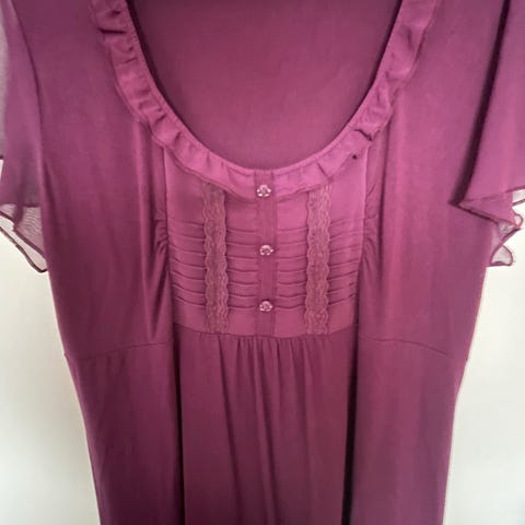 Grå kjole med stikklommer og knytebånd på halvlange ermer.