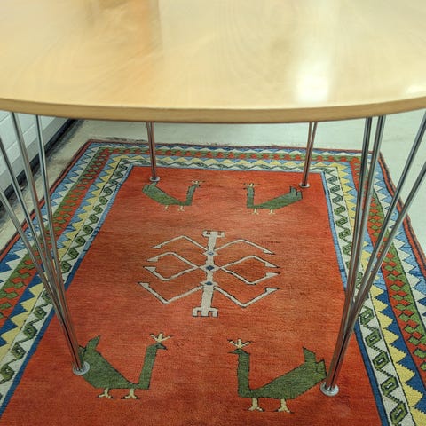 Vakkert spisebord fra midten av 1900-tallet, kjøpt på auksjon i Sverige. Bordet har elegant intarsia og et tidløst uttrykk, og kan muligens tilskrives Svante Skogh.
