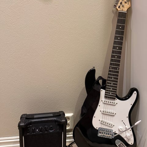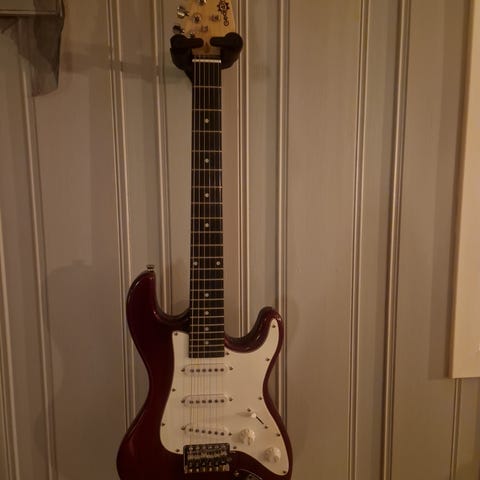 To små hakk i gitaren, men ellers ser den hel og pen ut.