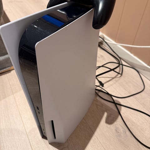Sony Playstation 5 spillkonsoll i hvit farge. Følger med med trådløs kontroll, ladekabel og strømkabel.