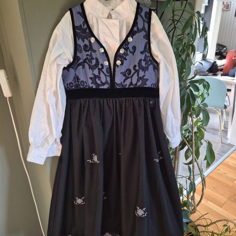 Pen strikket festdrakt til barn str. 122-128. Ligner en bunad med hempe på vest. Bukse følger med.