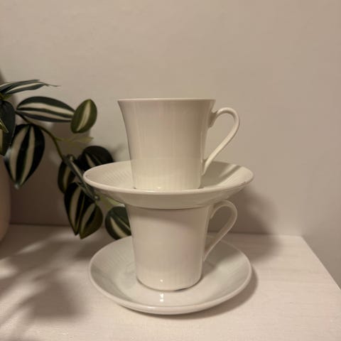 Veldig pen stand og flotte kopper som kan kombineres med hvite asjetter.