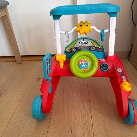 Fisher-Price aktivitetsleke med gåvogn i flere farger. Leken har ulike interaktive elementer som knapper, piano og roterende deler for barnets motoriske utvikling og lek. Egnet for små barn som lærer å gå og utforske sanser.