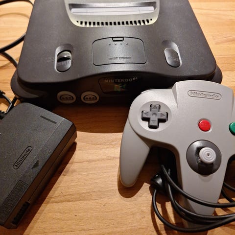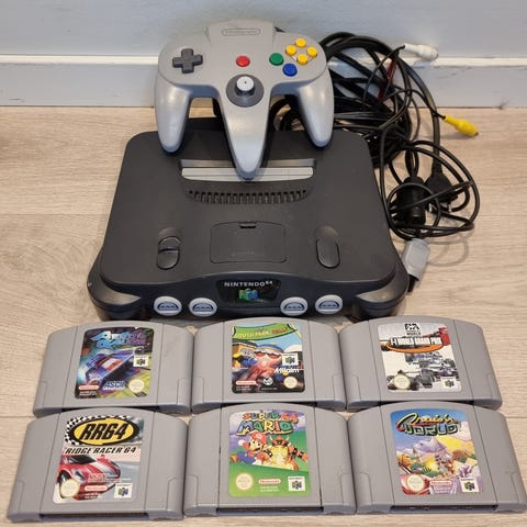 Nintendo 64 spillkonsoll inkludert en grå kontroller med fargede knapper og et spillkassett. [ mario 64 ]Konsollen har standard tilkoblinger og strømforsyning, og kontrolleren er kablet. Spillkassetten er kompatibel med Nintendo 64 systemet.