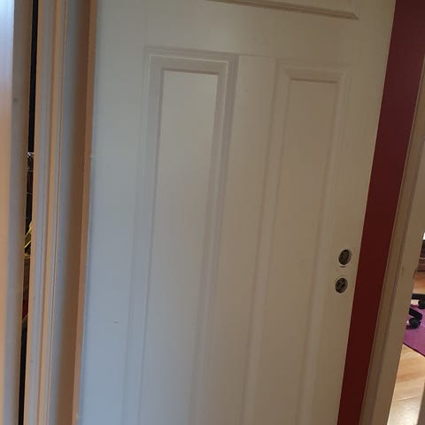 Døren har standard design og passer til vanlige innvendige døråpninger.