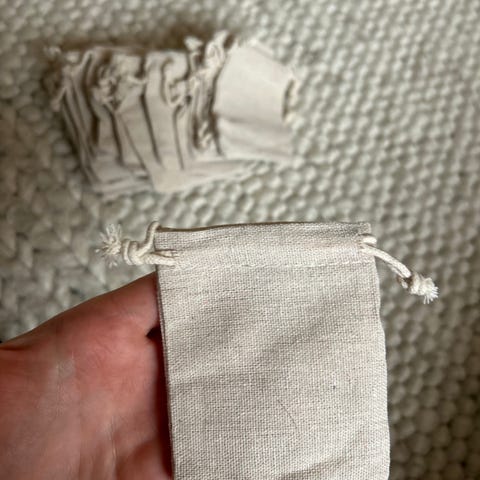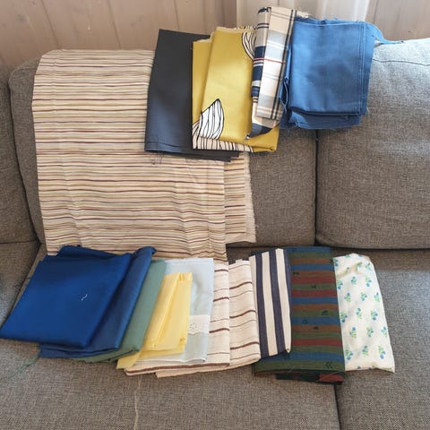 Pakke med ulike tekstiler i forskjellige farger og mønstre