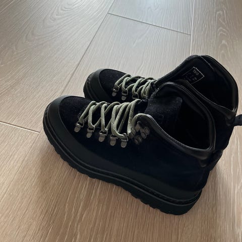 Støvlene har solide gummisåler med godt grep og snøring foran for justerbar passform. Materialet er semsket skinn, med polstret ankel for ekstra komfort.