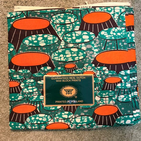 Mørkegrønt stoff laget av boucle-materiale. Kjøpt hos tyg.se. 3,5 meter. 100 % polyester.