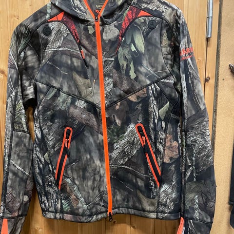 Härkila moose hunter dunvest i størrelse M. Vesten har camo-mønster på utsiden og oransje farge på innsiden.