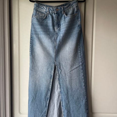 Fint denim skjørt fra NA-KD🥰 Brukt svært lite og har ingen bruksmerker. Rekker meg til litt over midt på leggen. Størrelse 34. Pris kan diskuteres ved rask avgjørelse✨