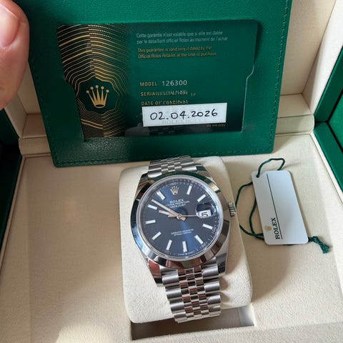Rolex Datejust 41 Blue Gem-Set Dial 126334 selges, original boks og utstyr følger med. Kjøpt desember 2023 og svært lite brukt. Kjøpt på offisiell Rolex forhandler i London, Watches of Switzerland. Kvittering og Toll klarering følger med