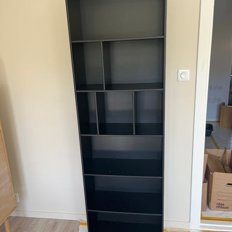 Hyllene er i god stand, men med noen små bruksmerker, se bilder. Den ene hyllen mangler en liten skrue på en av skilleveggene og veggen henger derfor litt ut (se bilde), men dette er enkelt å fikse.