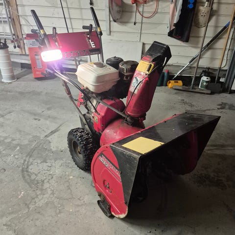 Eldre Honda HS80 med brøyteskjær og belter. Kommer seg godt frem.